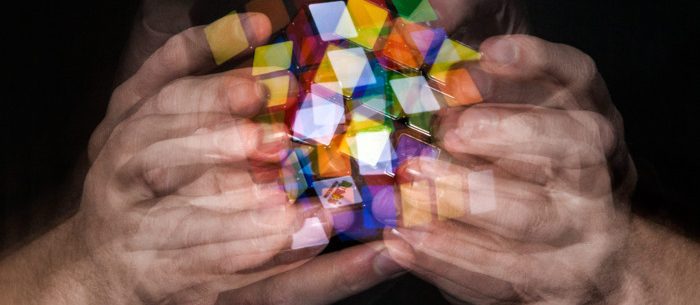 Until this point the procedure was pretty straight forward but from now on we have to use algorithms. We can forget the completed white face so let’s turn the cube upside down to focus on the unsolved side.
